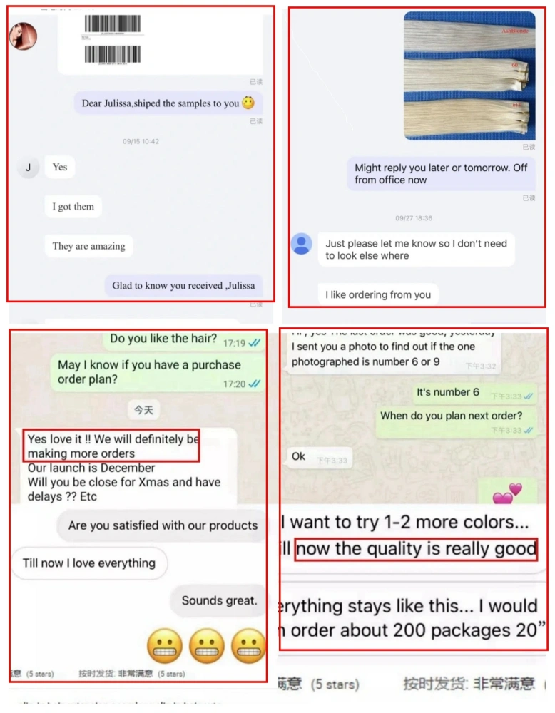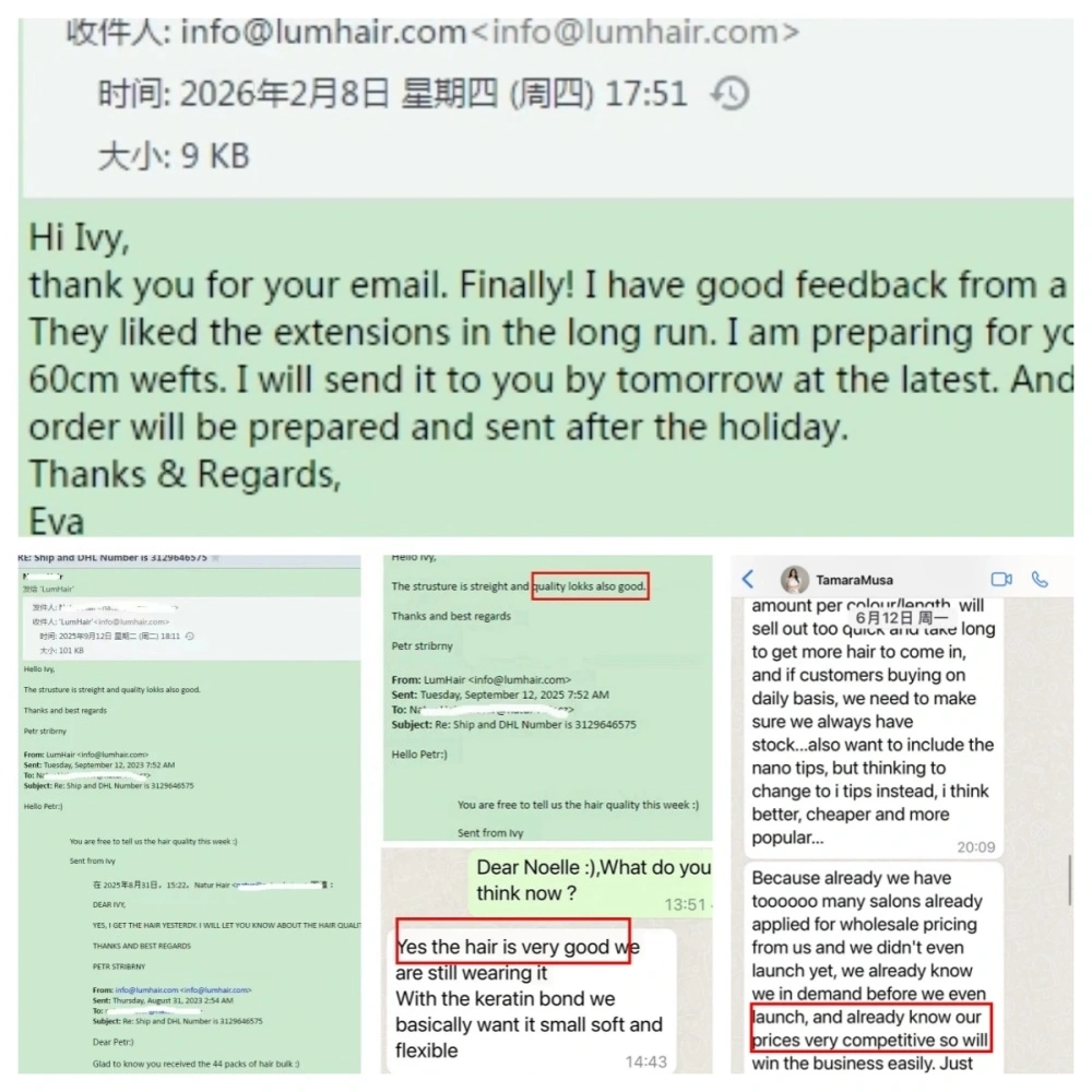 Os clientes da Lum Hair estão espalhados pelo Reino Unido, EUA, Canadá, Austrália, Dinamarca, Nova Zelândia, Noruega, Alemanha, França, Holanda, Suécia, Polônia, República Tcheca, Eslováquia, etc. Ivy, como gerente de vendas, pode falar inglês fluentemente para uma boa comunicação.