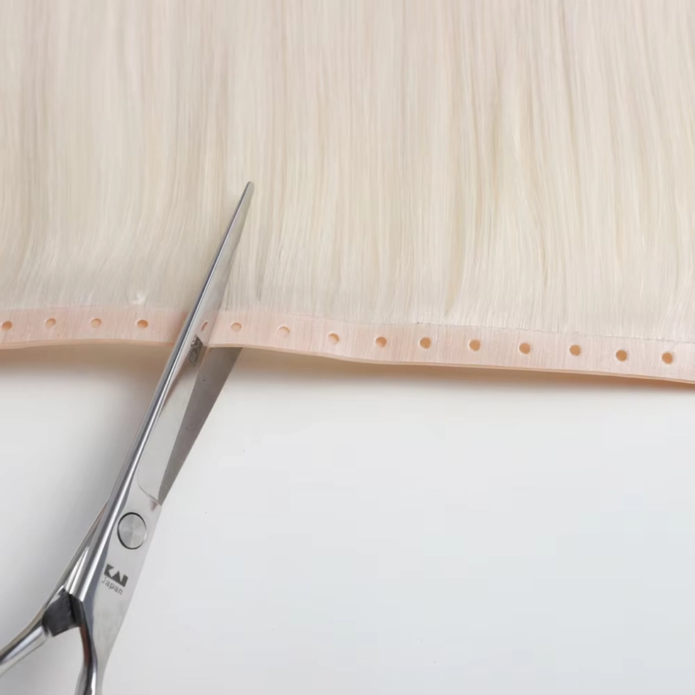 Etapa 3: Instale com precisão Posicione as Tramas Borboleta ao longo das fileiras âncora, alinhando-as com a queda natural do cabelo da cliente. Utilize uma tensão controlada para fixar as tramas através do canal do cordão – o aperto excessivo causa irritação no couro cabeludo, por isso encontre o ponto ideal entre segurança e conforto. Apare as tramas conforme necessário para se ajustar à curvatura da cabeça e dobre as bordas para evitar desfiar.