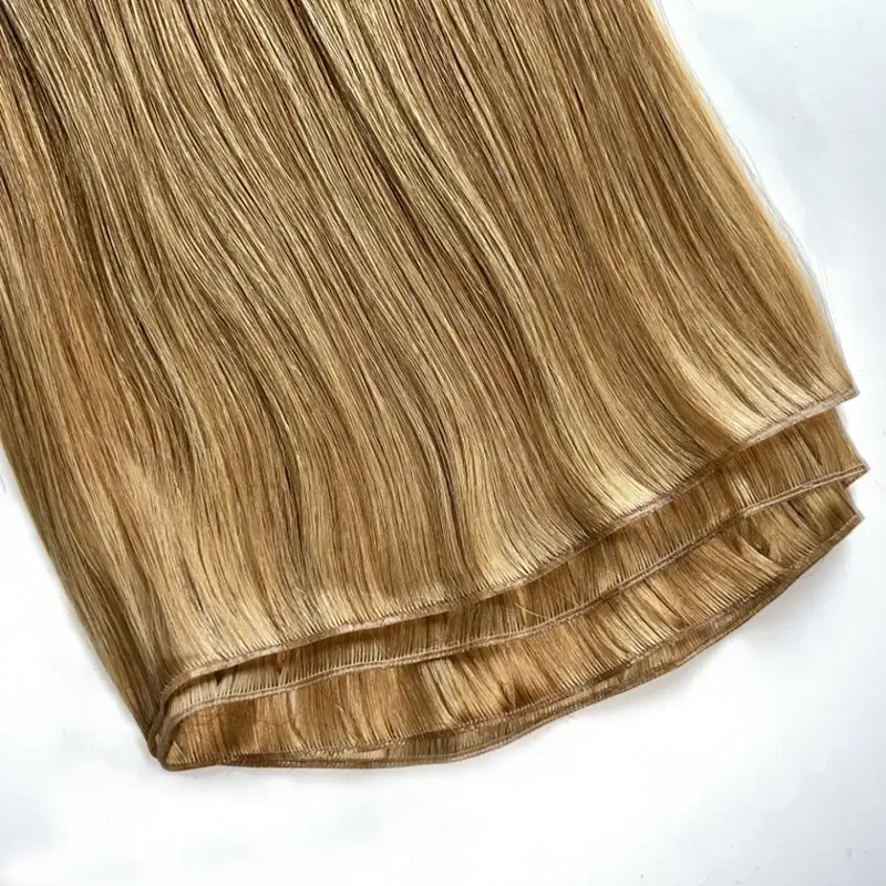 Nossas extensões de cabelo Genius Weft são o produto híbrido perfeito, combinando a suavidade das extensões de trama plana com a suavidade das extensões de trama amarradas à mão.